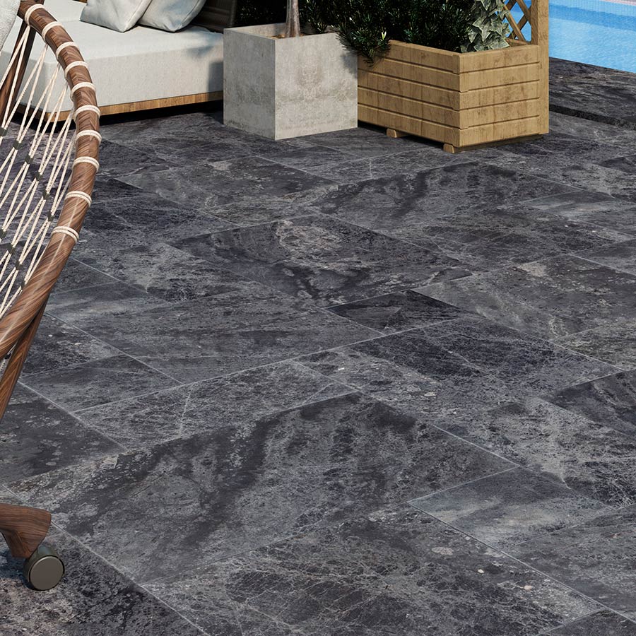 - La finition unique des revêtements en marbre sombre sablé ajoute une touche sophistiquée à tout espace extérieur.